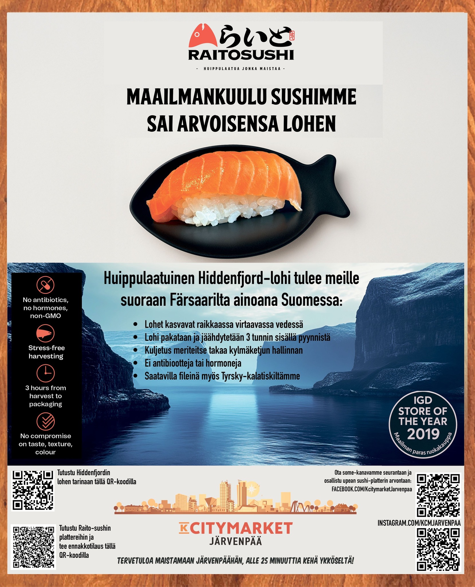 Järvenpää, 6. kesäkuuta 2025 K-Citymarket Järvenpään arvostettu Raito-sushi on saanut arvoisensa huippulohen: maailman puhtaimmissa vesissä kasvanut, huippukokkien ylistämä Hiddenfjordin lohi Färsaarilta. Tämä vastuullisesti tuotettu premium-lohi nostaa Suomen parhaan sushin entistä korkeammalle tasolle ja nyt sitä saa ainoastaan Järvenpäästä.